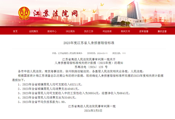 根据国家统计局江苏调查总队近期公布的统计数据,现将确定人身损害赔偿标准所依据的2023年度相关统计数据通报如下: